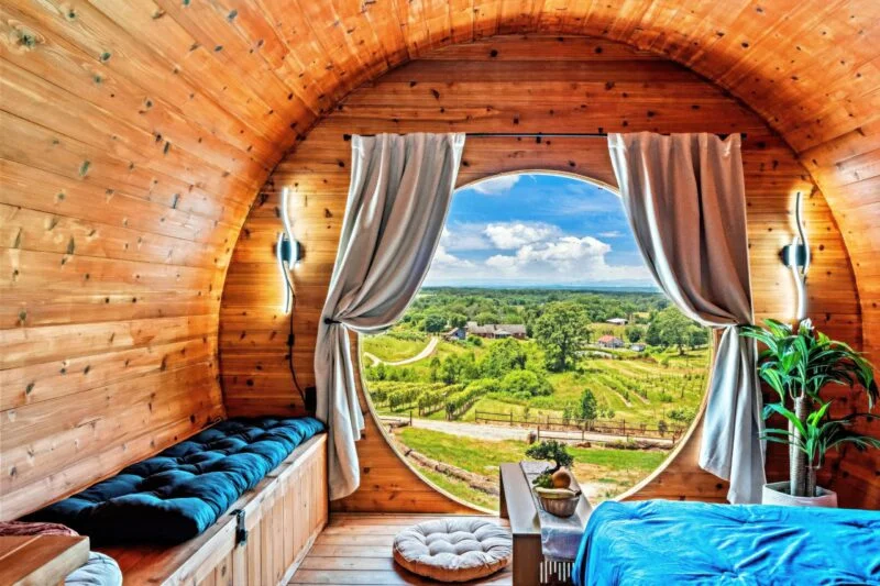 Stay overnight in a cozy barrel cabin at Chateau Jourdain Vineyard.